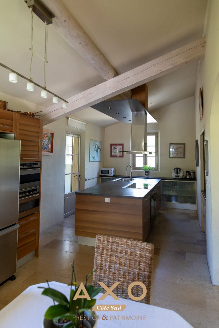 La cuisine équipée et son îlot central, espace de gourmandise et de convivialité, s'ouvre sur la terrasse couverte et sur une seconde terrasse ombragée au nord, idéale pour les heures les plus chaudes.