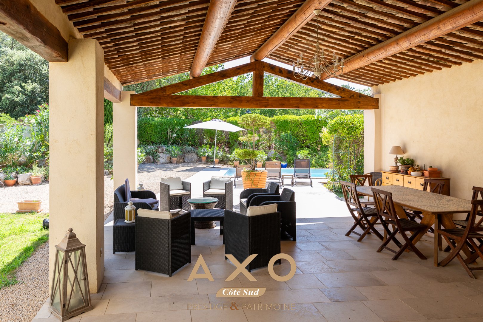 Côté ouest, une entrée d'invités, discrète et raffinée, s'ouvre après un majestueux portail en fer forgé, uvre d'un maître ferronnier d'art. Un jardin paysager s'étire alors, menant à la piscine chauffée et sécurisée, agrémentée d'une rampe à remous. Véritable invitation à la douceur de vivre, une terrasse de 50 m² baignée de soleil prolonge cet espace enchanteur.