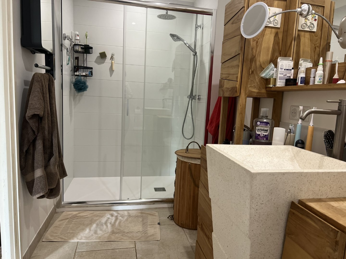 Le mas offre, au rez-de-chaussée, une partie privative comprenant un salon avec cheminée, une cuisine équipée, une chambre et une salle d'eau. À l'étage, quatre chambres lumineuses, chacune avec salle d'eau en-suite, offrent un accueil optimal pour une grande famille ou une activité d'hébergement.